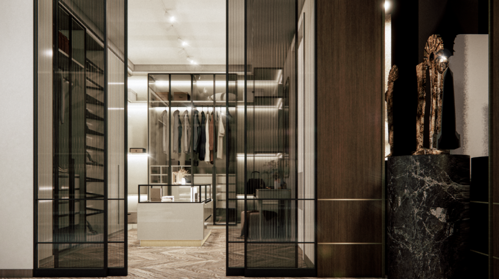 Custom designed, sleek, ample storage, and a touch of glamor.