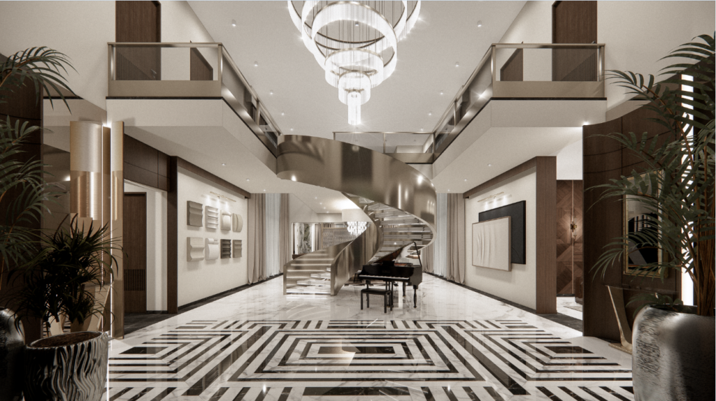 Breathtaking ethereal spiral staircase, elegant marble flooring, and a captivating chandelier.